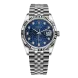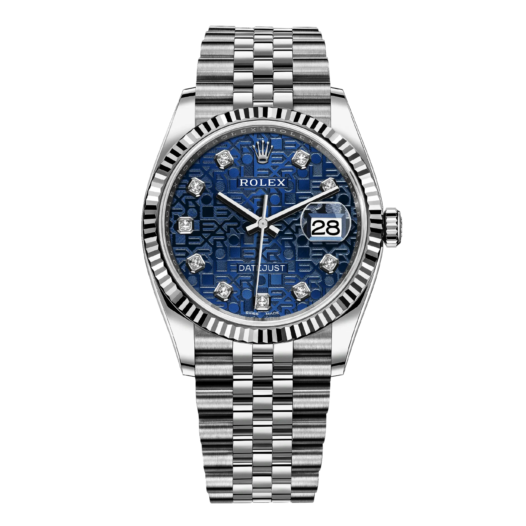 Rolex Datejust 116234 Uhrwerk: Automatik Gehäusegröße: 36 mm Gehäusematerial: Stahl und Weißgold Armbandmaterial: Stahl (Jubilee) Zifferblatt: Blaues Jubilee-Diamant Zifferblatt Wasserdichtigkeit: 100 Meter