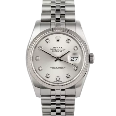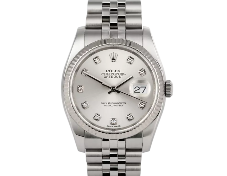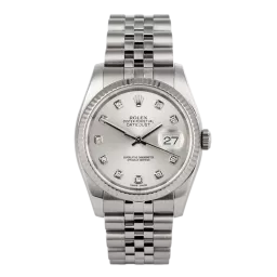 Rolex Datejust 116234 Uhrwerk: Automatik Gehäusegröße: 36 mm Gehäusematerial: Stahl und Weißgold Armbandmaterial: Stahl (Jubilee) Zifferblatt: Silber Diamant Wasserdichtigkeit: 100 Meter