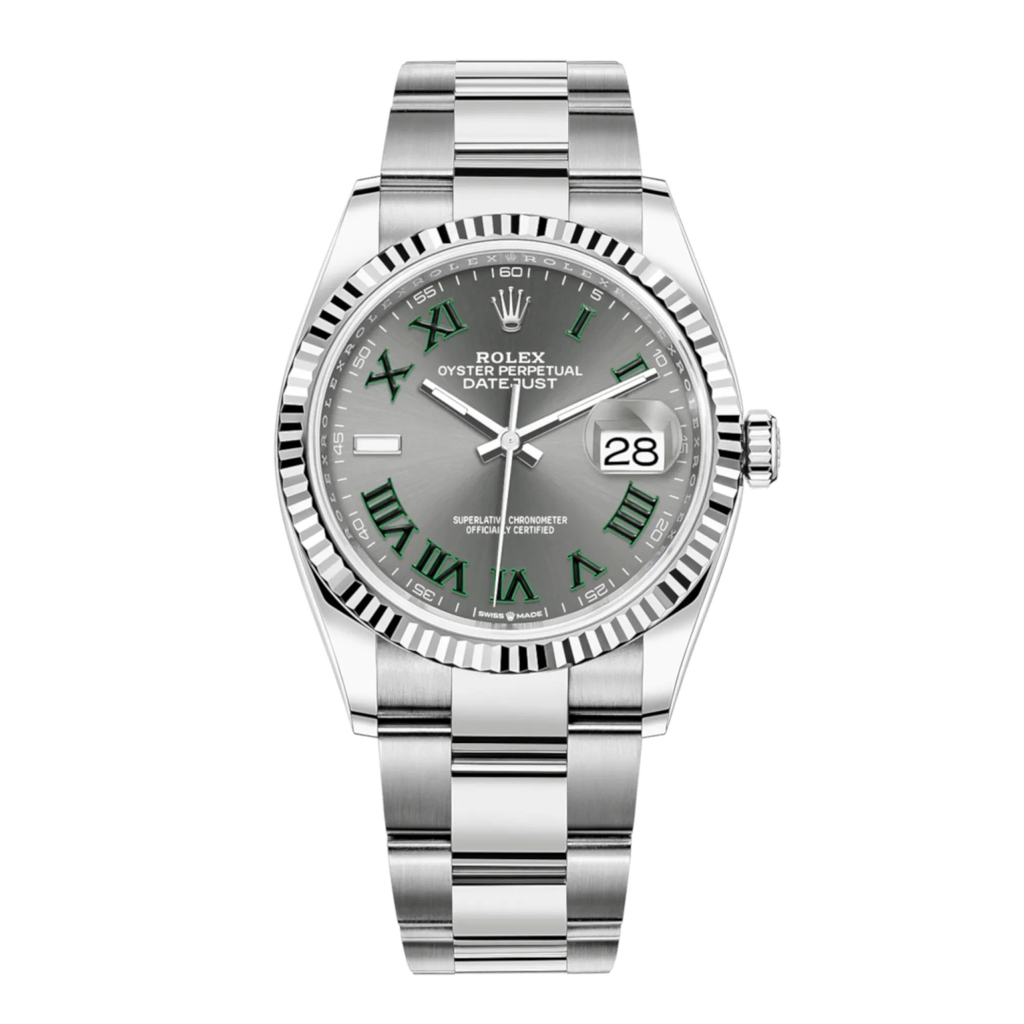 Rolex Datejust 126234 Uhrwerk: Automatik Gehäusegröße: 36 mm Gehäusematerial: Stahl und Weißgold Armbandmaterial: Stahl (Oyster) Zifferblatt: Schieferfarben mit römischen Ziffern Wasserdichtigkeit: 100 Meter