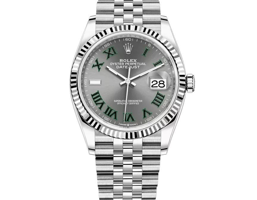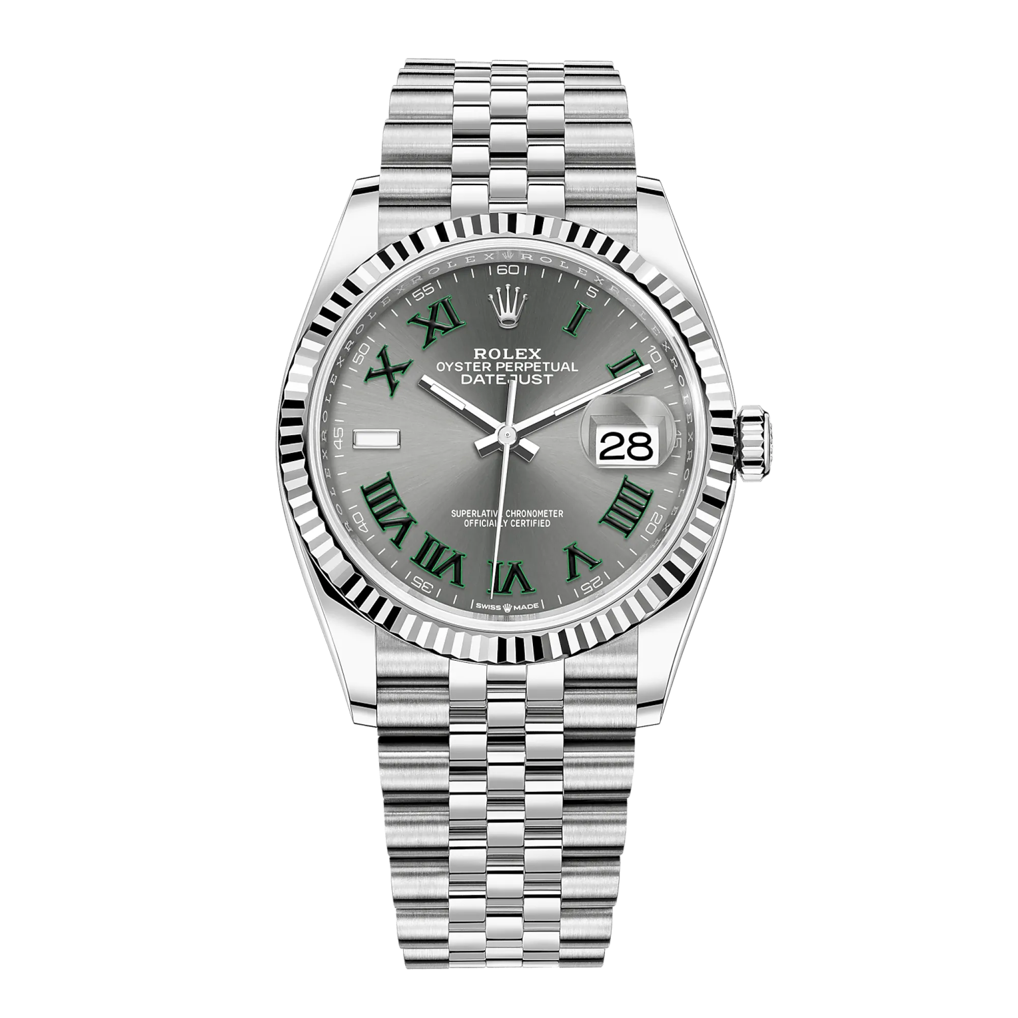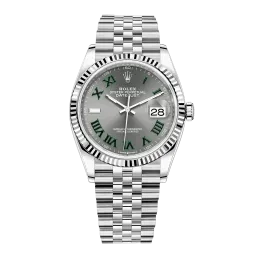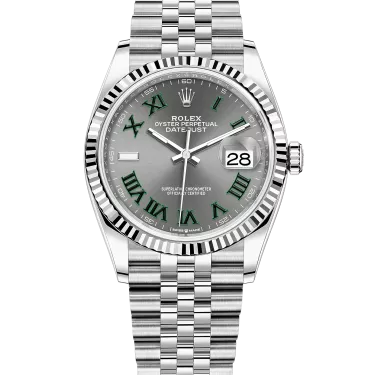 Rolex Datejust 126234 Uhrwerk: Automatik Gehäusegröße: 36 mm Gehäusematerial: Stahl und Weißgold Armbandmaterial: Stahl (Jubilee) Zifferblatt: Schieferfarben mit römischen Ziffern Wasserdichtigkeit: 100 Meter