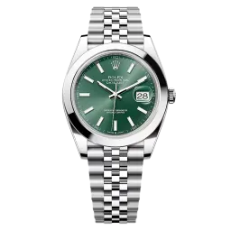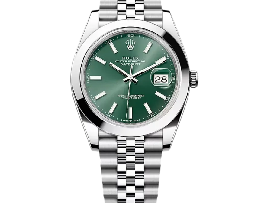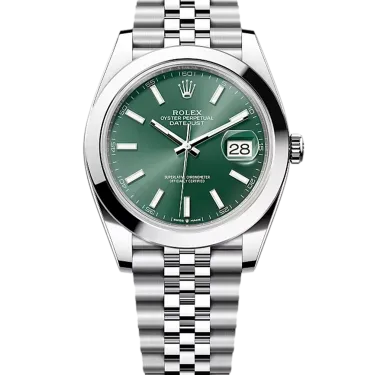Rolex Datejust 126300 41 mm, Edelstahlgehäuse und Jubilé-Armband, Faltschließe, grünes Zifferblatt, Automatikwerk, Uhrwerk/Kaliber 3135, 10 ATM wasserdicht.