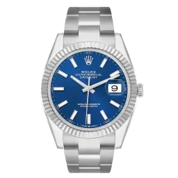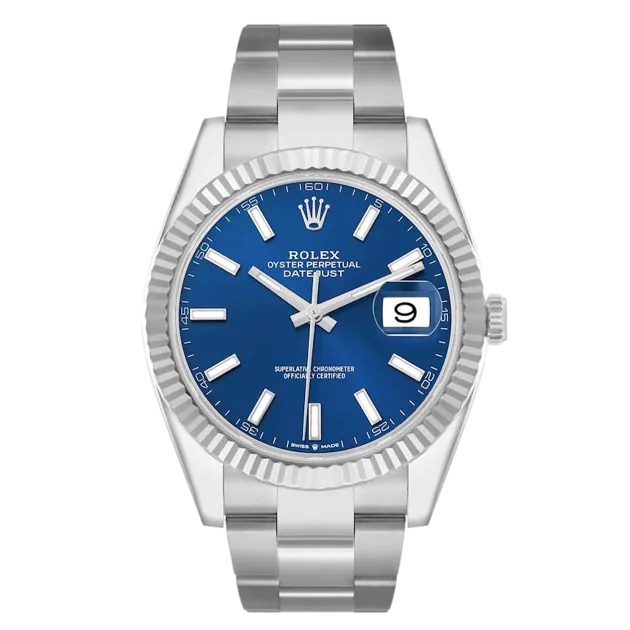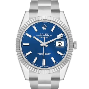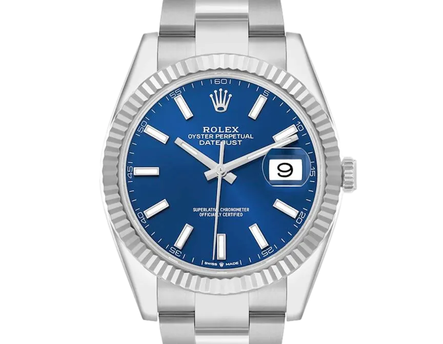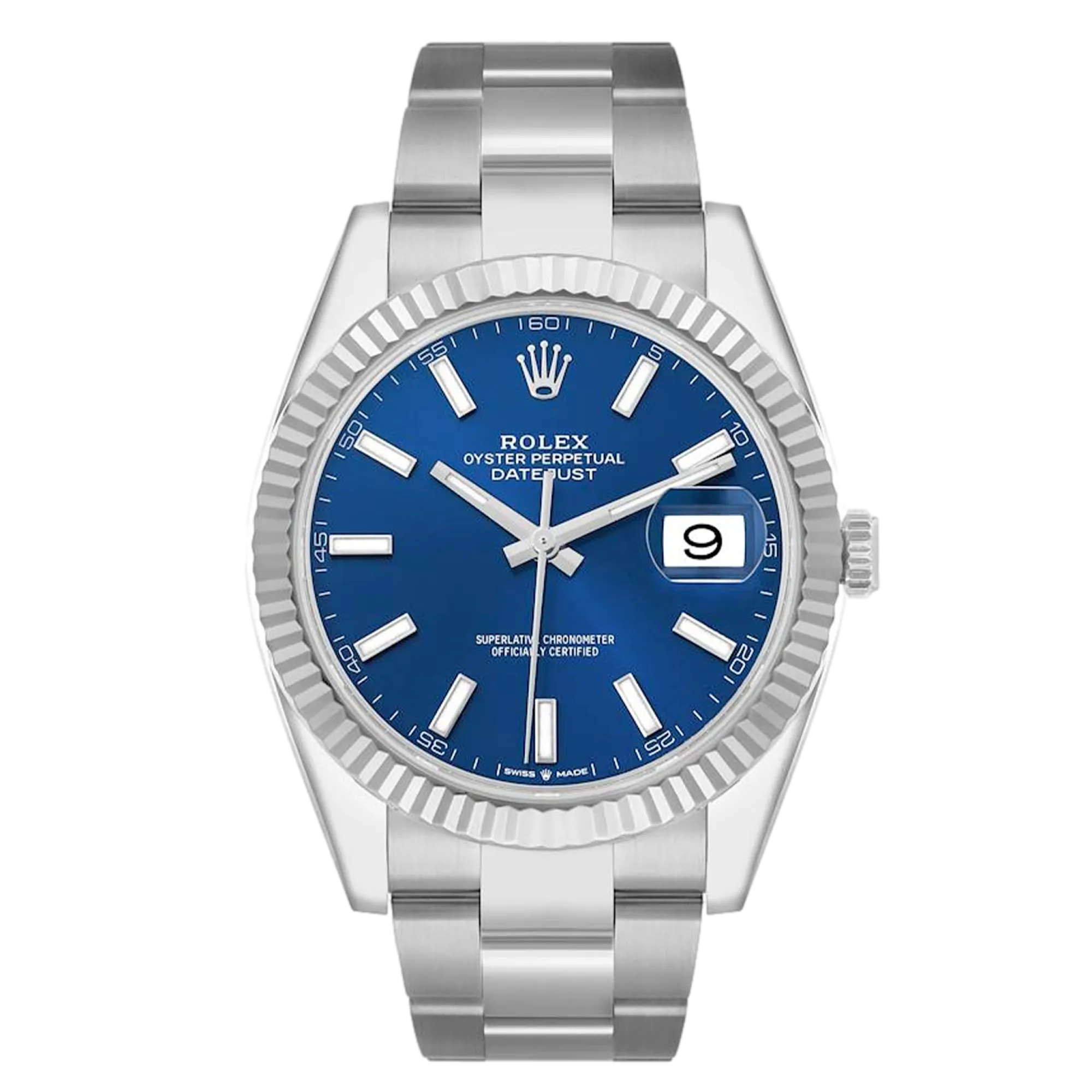 Rolex Datejust 41 Herrenuhr aus Stahl und Weißgold mit blauem Zifferblatt, Modell 126334. Offiziell zertifiziertes Chronometer mit automatischem Uhrwerk. Oyster-Gehäuse aus Edelstahl mit 41,0 mm Durchmesser. Rolex-Logo auf der Krone. Geriffelte Lünette aus 18 Karat Weißgold. Kratzfestes Saphirglas mit Zyklop-Lupe. Leuchtend blaues Zifferblatt mit leuchtenden Stabindexen und Zeigern. Zentraler Sekundenzeiger. Äußere Minutenskala. Datumsanzeige bei 3 Uhr. Oyster-Armband aus Edelstahl mit Oysterlock-Verschluss.