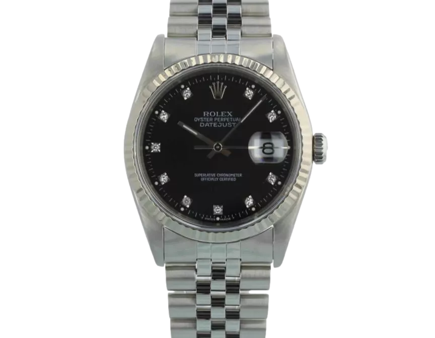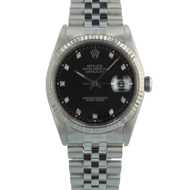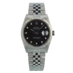 Rolex Datejust 16014 36 mm, Edelstahlgehäuse und Jubilé-Armband, Lünette aus Weißgold, Faltschließe, schwarzes Zifferblatt, Automatikwerk, Uhrwerk/Kaliber 3035, Wasserdichtigkeit bis 10 ATM, mit Originalverpackung, Originalpapieren und in einwandfreiem Zustand. Diese Uhr wurde geprüft, zertifiziert und einer Wasserdichtigkeitsprüfung unterzogen und hat eine Garantie von 2 Jahren ab Kaufdatum.