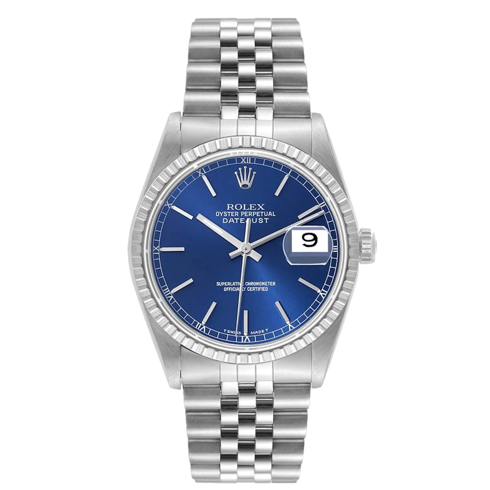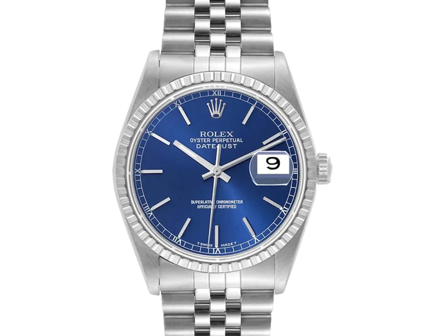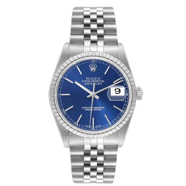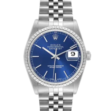 Rolex Datejust 16220 Uhrwerk: Automatik Gehäusegröße: 36 mm Gehäusematerial: Edelstahl Armbandmaterial: Edelstahl (Jubilee) Zifferblatt: Blau, Stabindexe und römische Ziffern Wasserdichtigkeit: 100 Meter