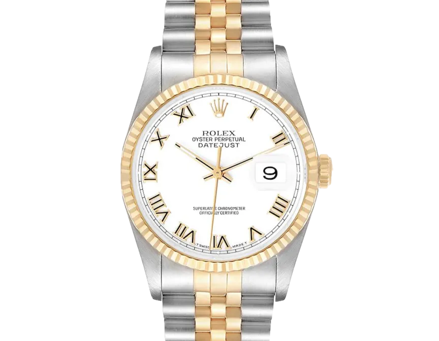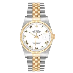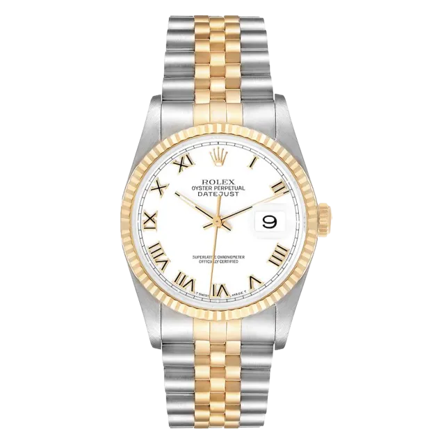 Rolex Datejust 16233 Uhrwerk: Automatik Gehäusegröße: 36 mm Gehäusematerial: Stahl und Gelbgold Armbandmaterial: Stahl und Gelbgold (Jubilee) Zifferblatt: Weiß mit römischen Ziffern Wasserdichtigkeit: 100 Meter