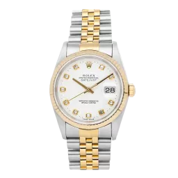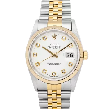 Rolex Datejust 16233 36 mm, Edelstahl-/Goldgehäuse und Jubilee-Armband, Lünette aus Gelbgold, Faltschließe, weißes Zifferblatt, Automatikwerk, Uhrwerk/Kaliber 3135, 10 ATM wasserdicht, mit Originalverpackung, Originalpapieren und in einwandfreiem Zustand. Diese Uhr wurde geprüft, zertifiziert und einer Wasserdichtigkeitsprüfung unterzogen und hat eine Garantie von 2 Jahren ab Kaufdatum.
