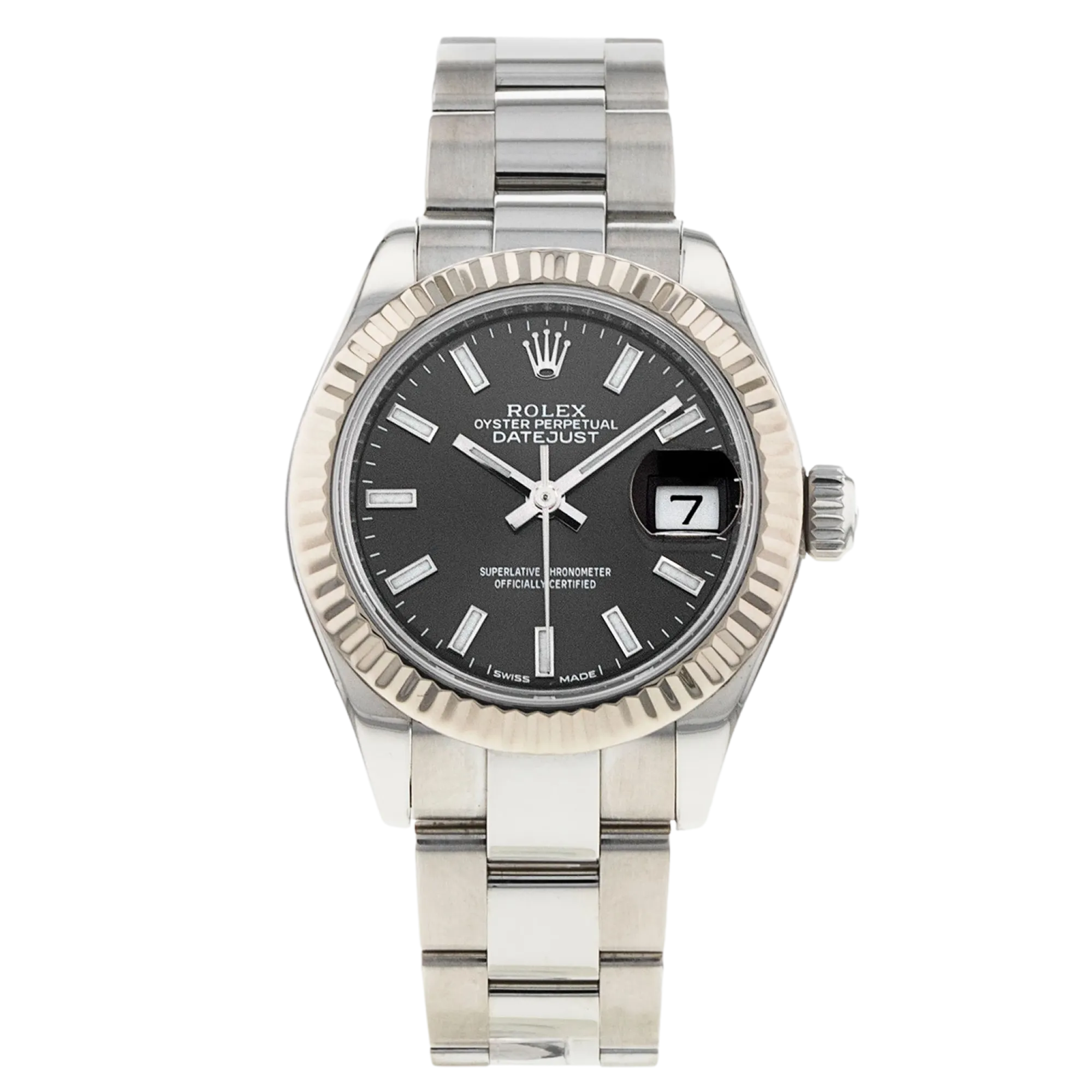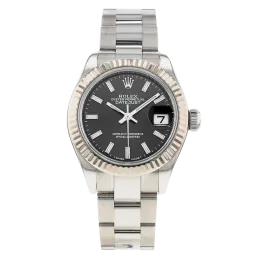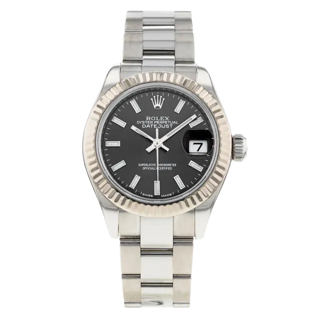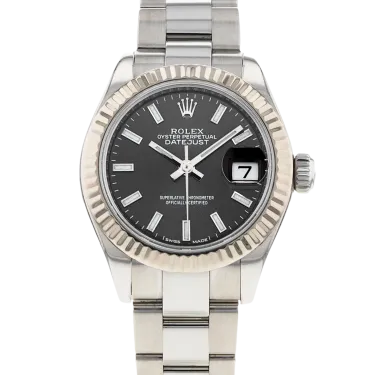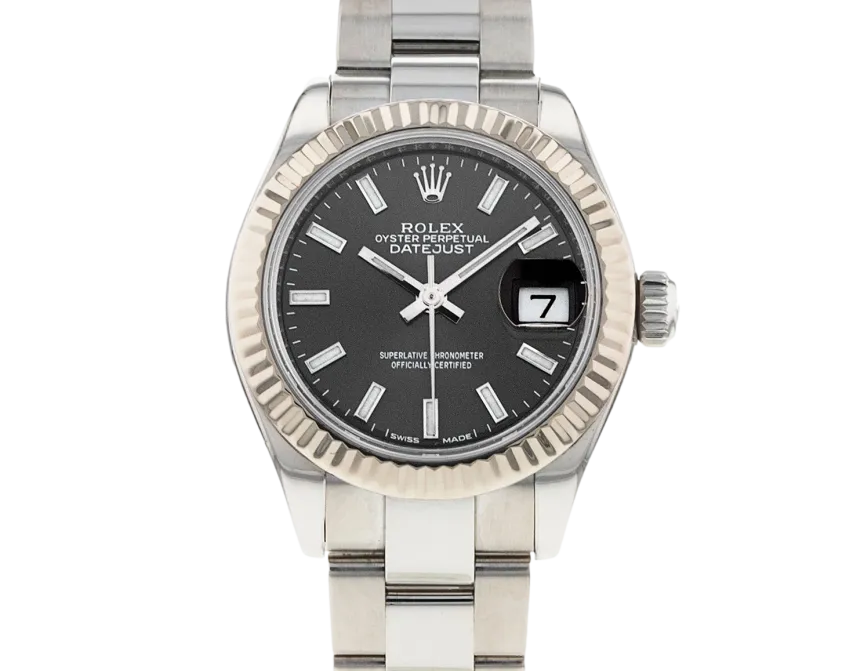 Rolex Datejust Lady 28 279174 Uhrwerk: Automatik Gehäusegröße: 28 mm Gehäusematerial: Stahl und Weißgold Armbandmaterial: Stahl (Oyster) Zifferblatt: Dunkelgrau, Baton Wasserdichtigkeit: 100 Meter
