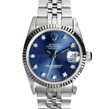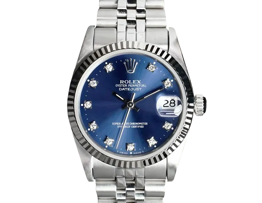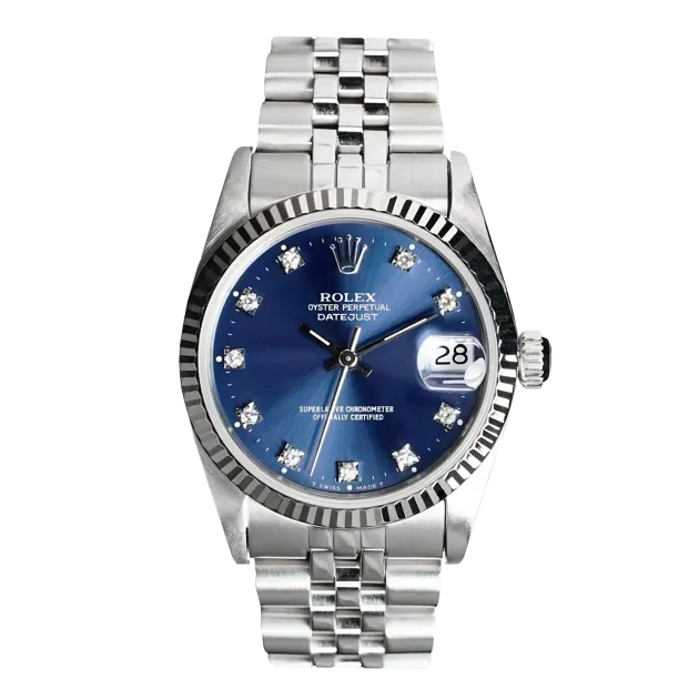 Rolex Datejust 68274 31 mm, Edelstahlgehäuse und Jubilee-Armband, Lünette aus Weißgold, Faltschließe, blaues Zifferblatt, Automatikwerk, Uhrwerk/Kaliber 2135, 10 ATM wasserdicht, mit Originalverpackung, Originalpapieren und in einwandfreiem Zustand. Diese Uhr wurde geprüft, zertifiziert und einer Wasserdichtigkeitsprüfung unterzogen und hat eine Garantie von 2 Jahren ab Kaufdatum.