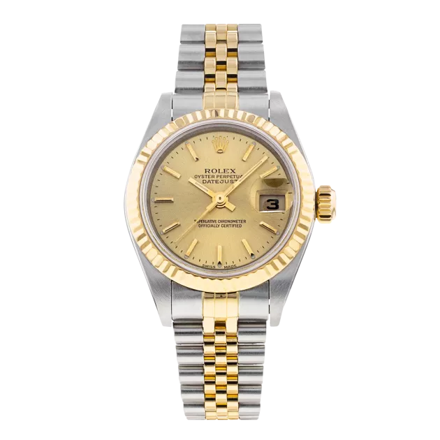Rolex Datejust Lady 79173 Uhrwerk: Automatik Gehäusegröße: 26 mm Gehäusematerial: Stahl und Gelbgold Armbandmaterial: Stahl und Gelbgold (Jubilee) Zifferblatt: Champagnerfarben mit Stabindexen Wasserdichtigkeit: 100 Meter