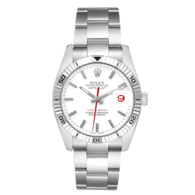 Rolex Datejust Turn-O-Graph 116264 36 mm, Stainless steel case and Oyster strap, White gold bezel, Fold clasp, White dial, Automatic movement, Movement/Caliber 3135, 10 ATM water resistance with original box, original papers and is in perfect working conditions. This watch has been checked, certified and carried out the water resistance test and has 2-year warranty from the date of purchase.
