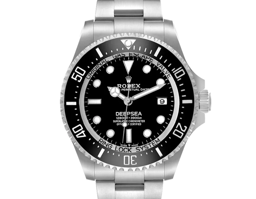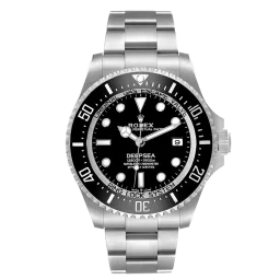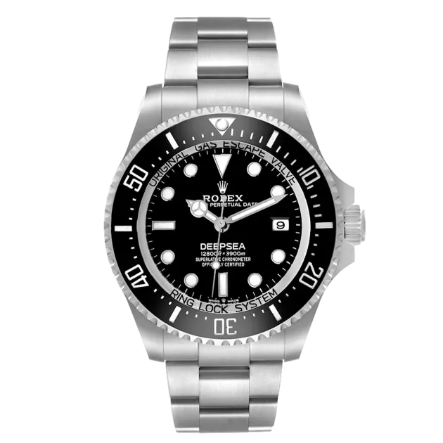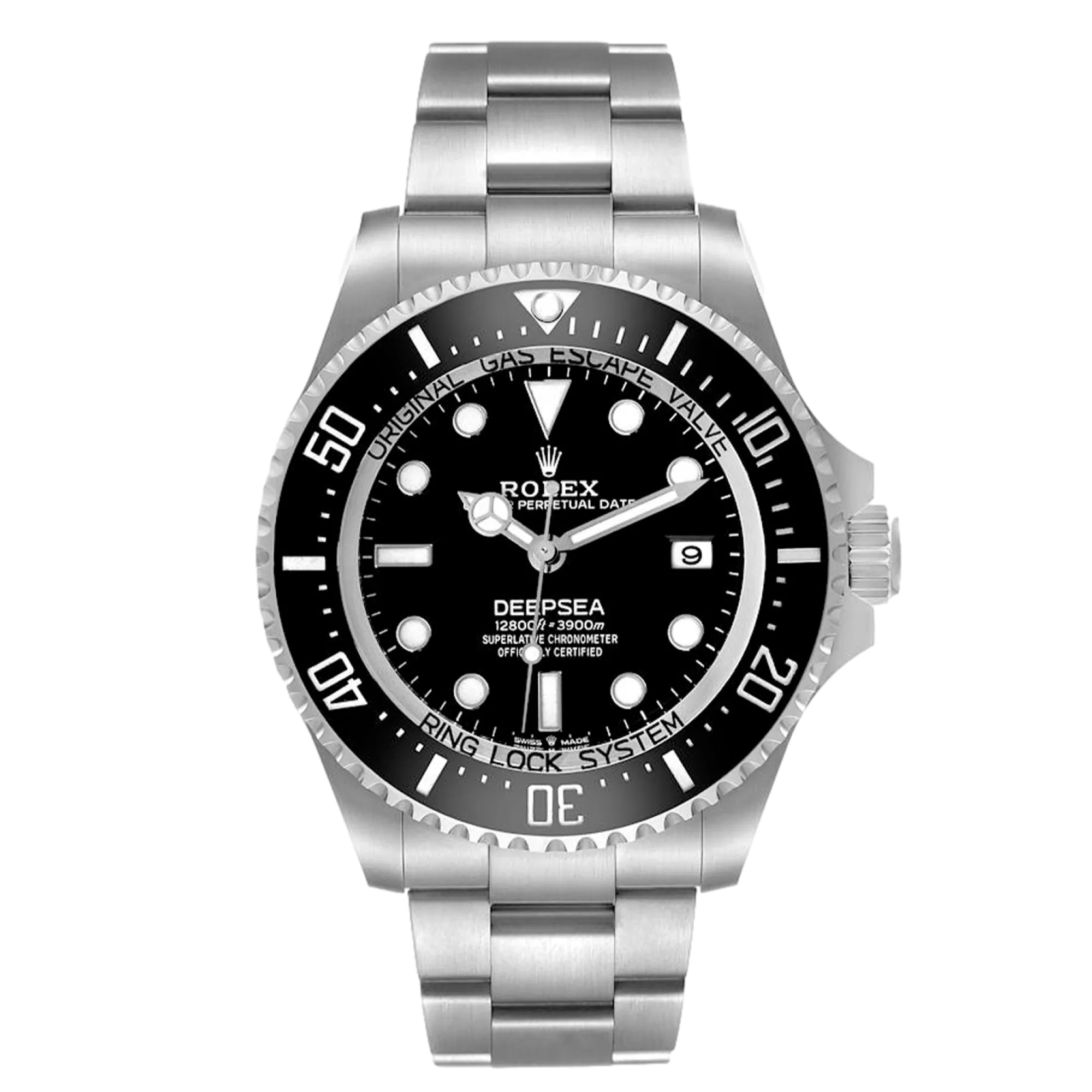 Rolex Seadweller Deepsea Herrenuhr aus Edelstahl mit schwarzem Zifferblatt 136660. Offiziell zertifizierter Chronometer, automatisches Uhrwerk mit Selbstaufzug. Paramagnetische blaue Parachrom-Spirale. Hochleistungs-Paraflex-Stoßdämpfer. Oyster-Gehäuse aus Edelstahl mit 44,0 mm Durchmesser. Heliumventil bei 9 Uhr. Spitz zulaufende Kronenschutzbügel. Rolex-Logo auf der Krone. Spezielle, einseitig drehbare Cerachrom-Keramiklünette mit Zeitraffer-Einstellung und platinierter 60-Minuten-Skala. Gewölbtes, kratzfestes Saphirglas. Intensiv schwarzes Zifferblatt mit weißen, lumineszierenden Chromalight-Mercedes-Zeigern und Punkt-Indexen. Lumineszierender Zentralzeiger mit Lollipop-Spitze. Minutenmarkierungen am äußeren Rand. Datumsanzeige bei 3 Uhr. Oyster-Armband aus Edelstahl mit Flip-Lock-Verschluss.