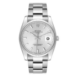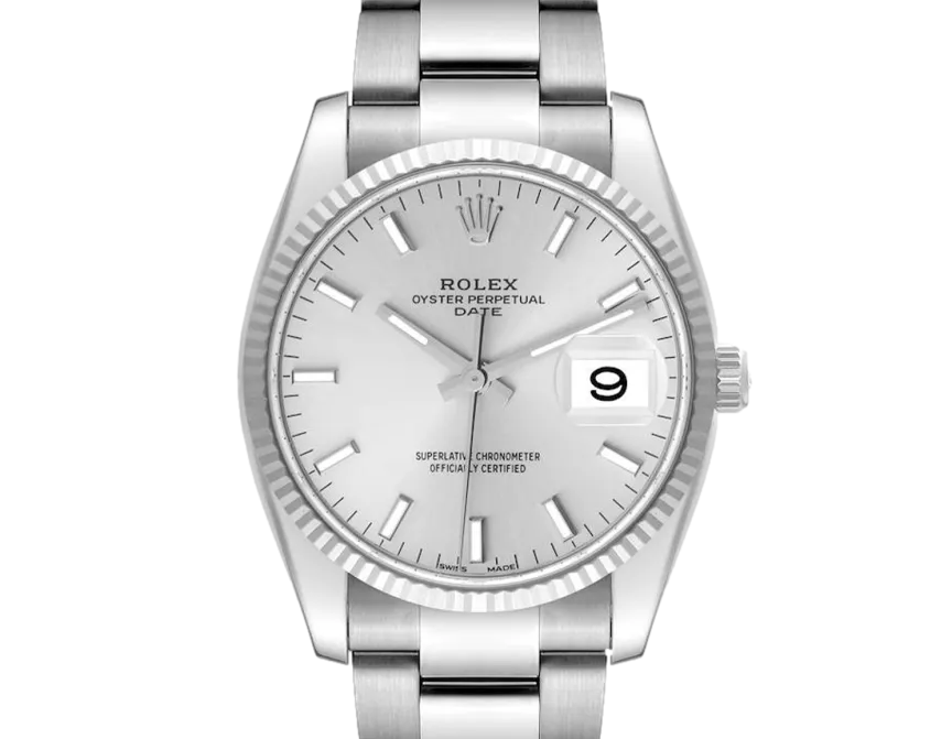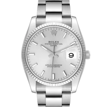 Rolex Oyster Perpetual Date 115234 Uhrwerk: Automatik Gehäusegröße: 34 mm Gehäusematerial: Stahl und Weißgold Armbandmaterial: Stahl (Oyster) Zifferblatt: Silber mit Stabindexen Wasserdichtigkeit: 100 Meter