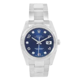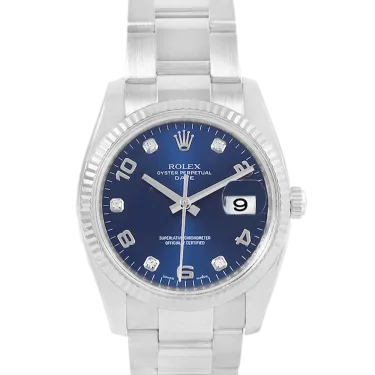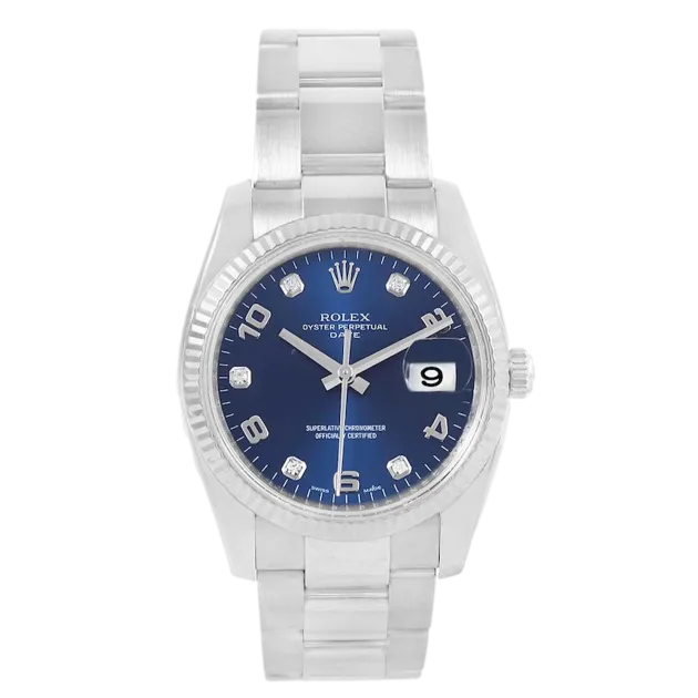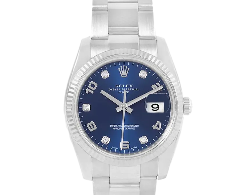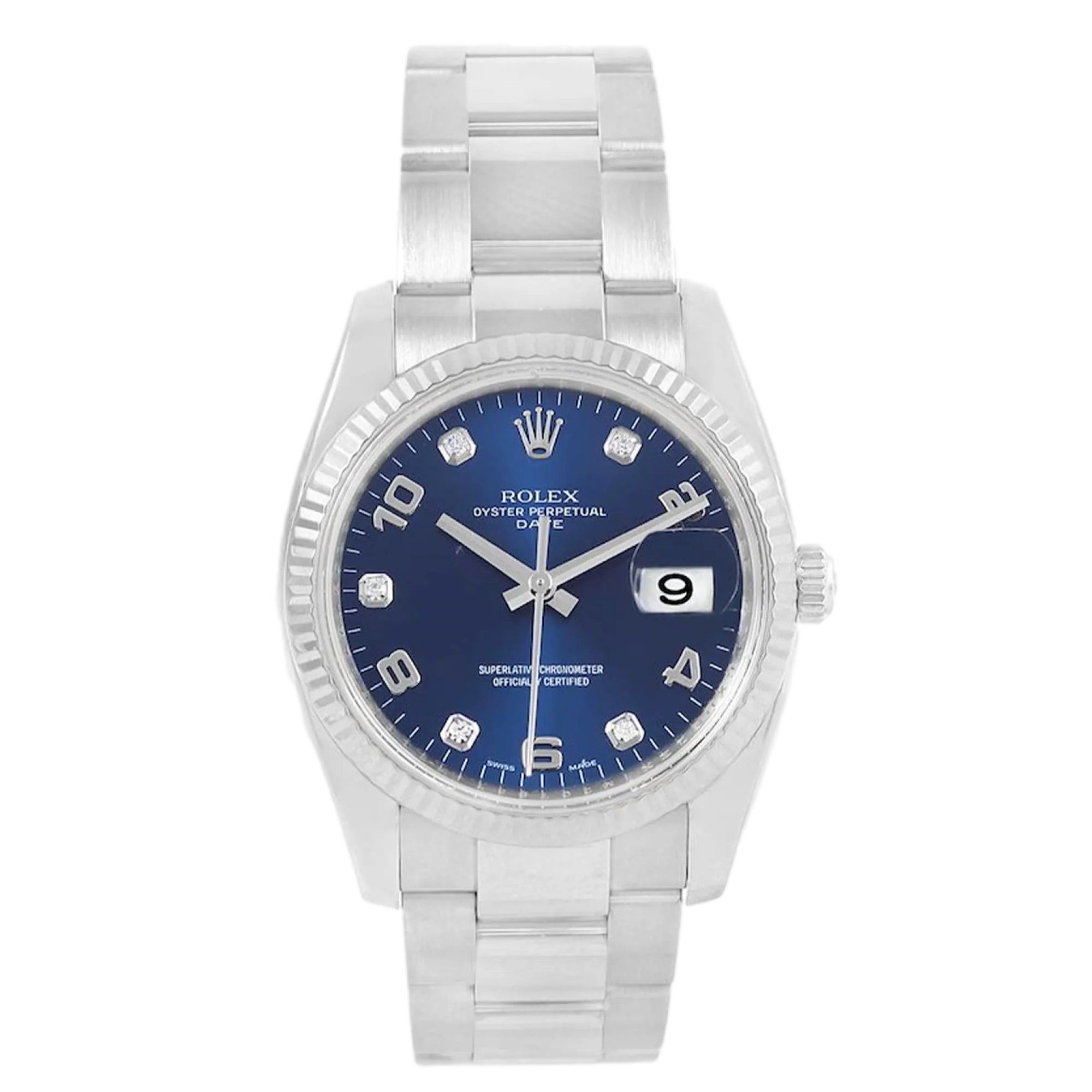 Rolex Oyster Perpetual Date 115234 34 mm, Edelstahlgehäuse und Oyster-Armband, Lünette aus Weißgold, Faltschließe, blaues Zifferblatt, Automatikwerk, Uhrwerk/Kaliber 3135, 10 ATM wasserdicht, mit Originalverpackung, Originalpapieren und in einwandfreiem Zustand. Diese Uhr wurde geprüft, zertifiziert und einer Wasserdichtigkeitsprüfung unterzogen und hat eine Garantie von 2 Jahren ab Kaufdatum.
