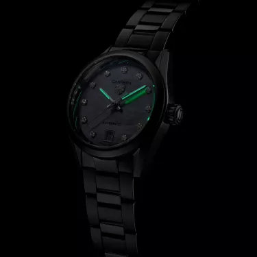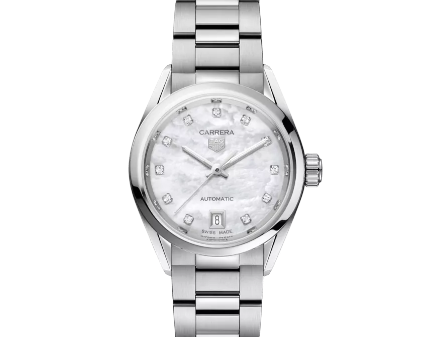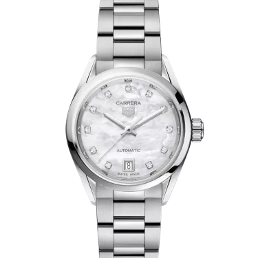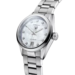 Diese elegante und selbstbewusste TAG Heuer Carrera strahlt selbstbewussten Luxus aus. Sie bietet eine Kombination aus edlen Materialien und feinen Details, die den ultimativen urbanen Look versprechen. Mit ihrem weißen Perlmuttzifferblatt und ihren 11 diamantbesetzten (0,088 ct) Stundenmarkierungen und rhodinierten Zeigern ist diese fein gearbeitete Automatikuhr ein wahres Stilbekenntnis. Das 29-mm-Gehäuse aus Edelstahl und das raffinierte Armband sind robust und markant. Hinter dem emblematischen Zifferblatt gibt das automatische Manufakturwerk Calibre 9 den Takt vor und verspricht höchste Präzision. Ein natürlicher Ausdruck der eigenen Persönlichkeit.