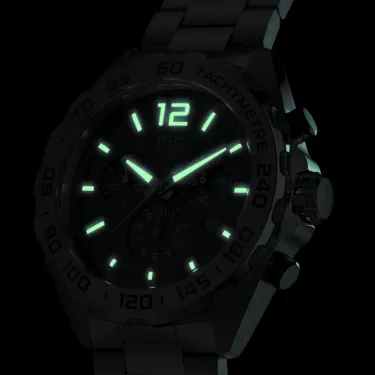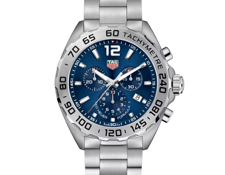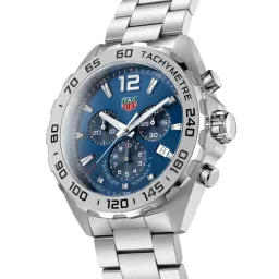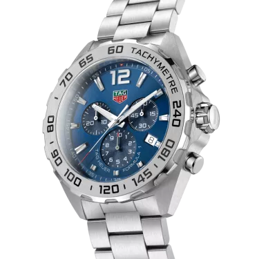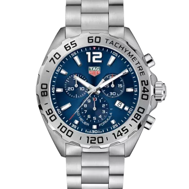 Diese 43 mm große Formula 1 ist eine Hochleistungsuhr für alle, die auf der Überholspur leben. Sie ist quarzbetrieben und bietet höchste Präzision. Ihr Gehäuse besteht aus fein gebürstetem poliertem Edelstahl. Das Zifferblatt mit blauem Sonnenstrahleneffekt wird von einer feststehenden Tachymeterlünette mit großen schwarzen Ziffern und einem passenden blauen Zifferblattring umrahmt, der die Minuten und Sekunden anzeigt. Das vergrößerte Zifferblatt bei 6 Uhr zeigt die Stunden und Zehntelsekunden an.