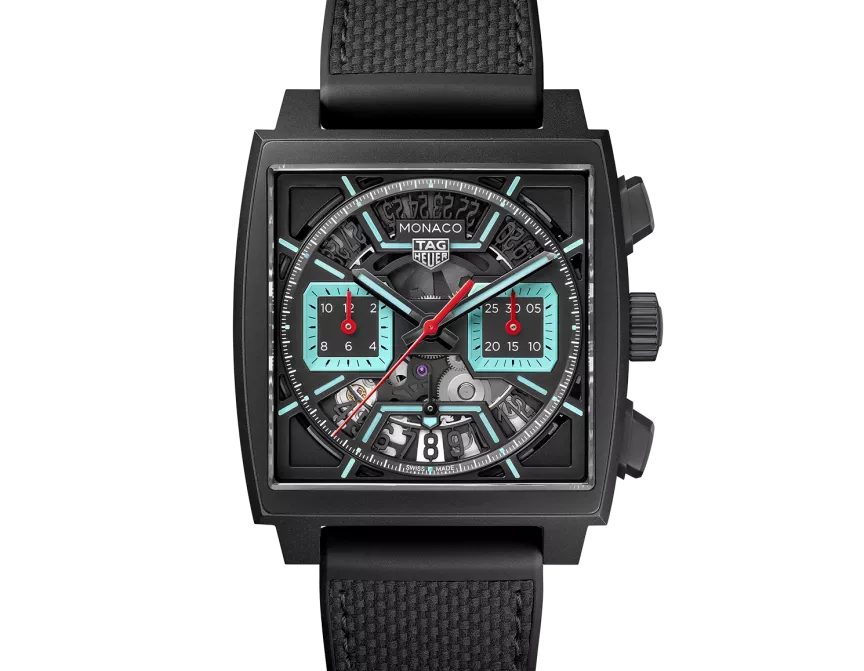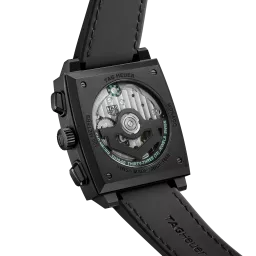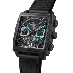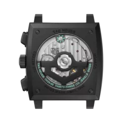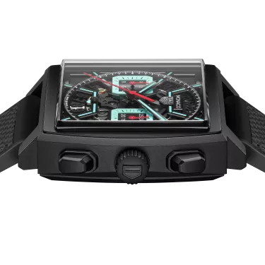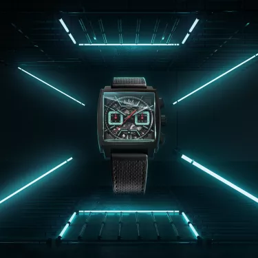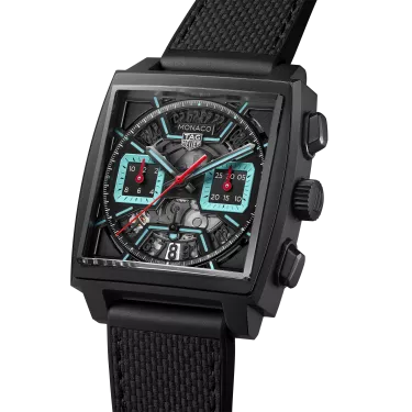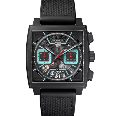 Die leuchtenden türkisfarbenen Akzente auf dem skelettierten Zifferblatt in Schwarz verleihen dieser avantgardistischen TAG Heuer Monaco einen kühnen Charakter. Das durch den Gehäuseboden aus Saphirglas sichtbare und ultrapräzise hauseigene Calibre Heuer 02 integriert das leichte Gehäuse aus Titan Grad 2, das mit hoher Widerstandsfähigkeit gegen Druck konzipiert wurde. Eine unzähmbare Legende.