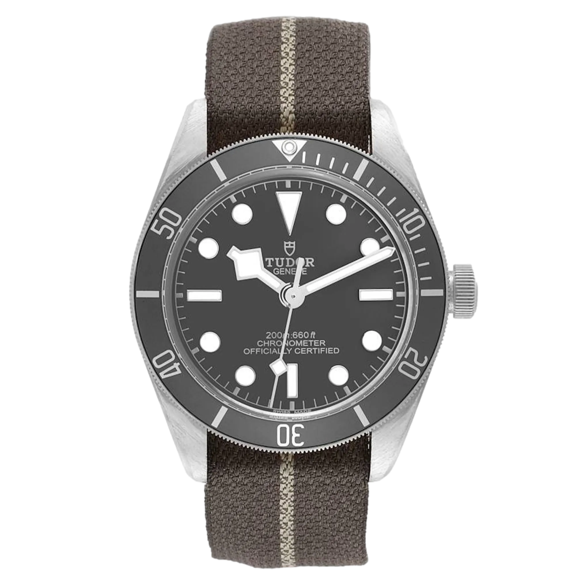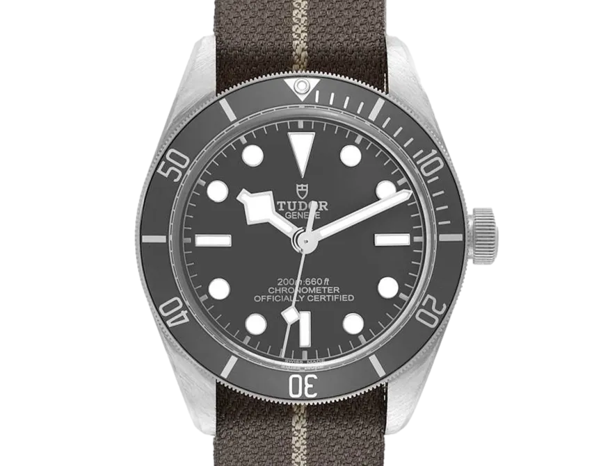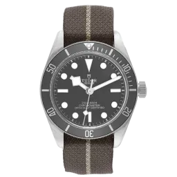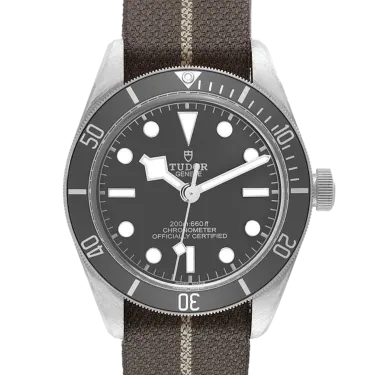 Tudor Black Bay 58 M79010SG-0002 Uhrwerk: Automatik Gehäusegröße: 39 mm Gehäusematerial: Silber Armbandmaterial: Stoff – Taupe Zifferblatt: Taupe Wasserdichtigkeit: 200 Meter