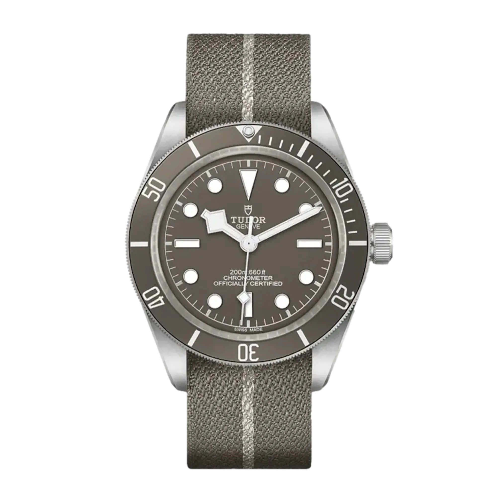 Tudor Black Bay 58 M79010SG-0002 Uhrwerk: Automatik Gehäusegröße: 39 mm Gehäusematerial: Silber Armbandmaterial: Stoff – Taupe Zifferblatt: Taupe Wasserdichtigkeit: 200 Meter