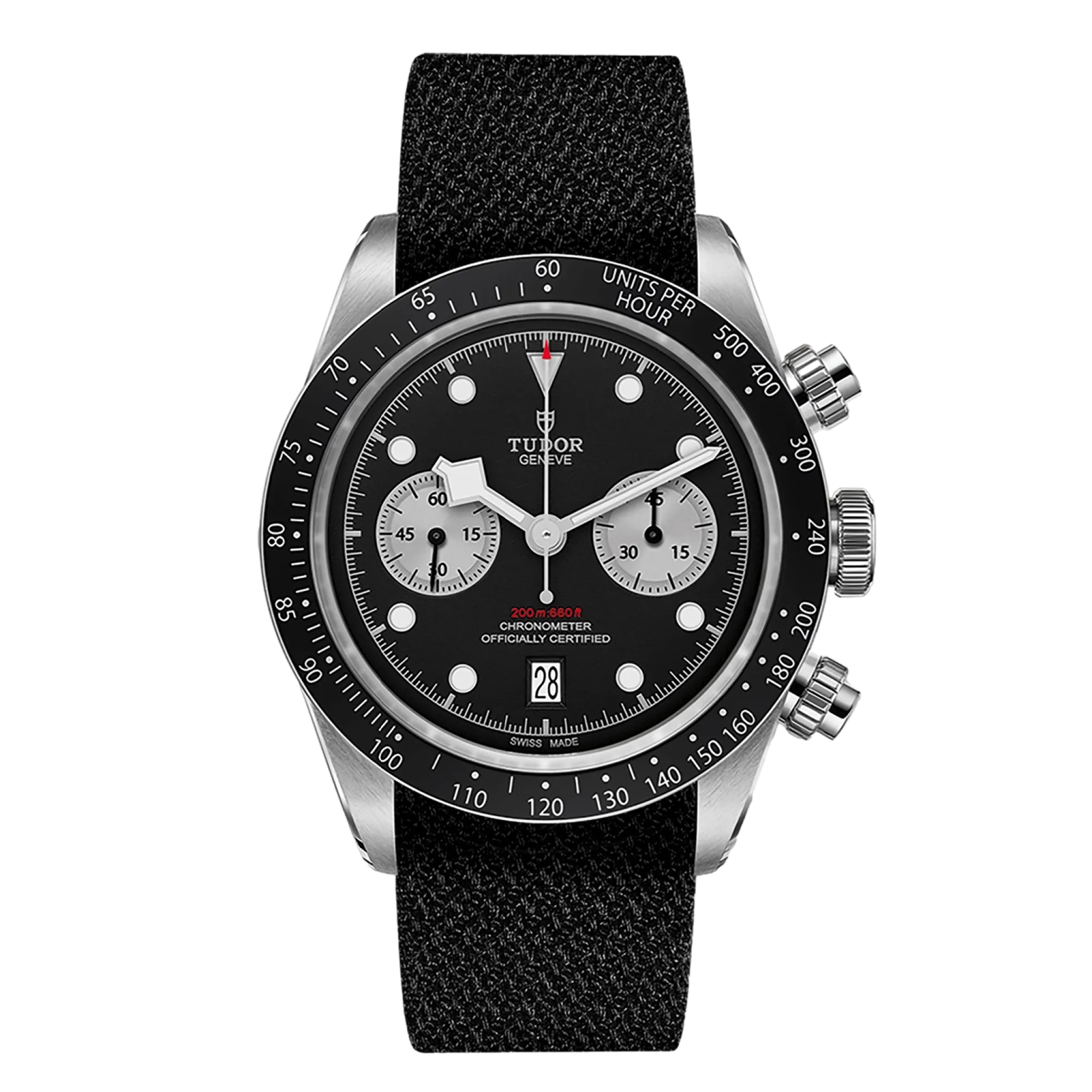 Tudor Black Bay Chrono M79360N-0007 Uhrwerk: Automatik Gehäusegröße: 41 mm Gehäusematerial: Stahl Armbandmaterial: Stoff – Schwarz Zifferblatt: Schwarz Wasserdichtigkeit: 200 Meter