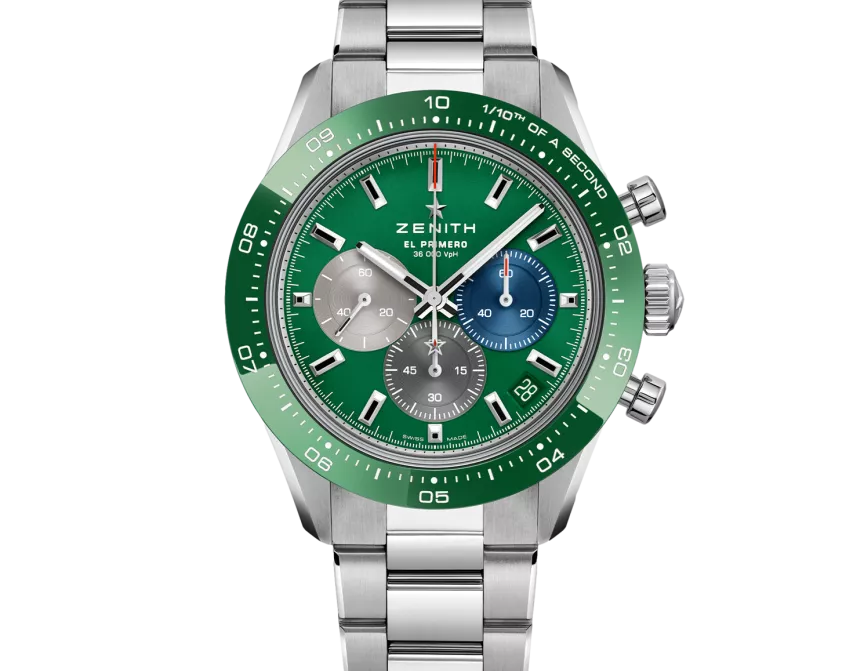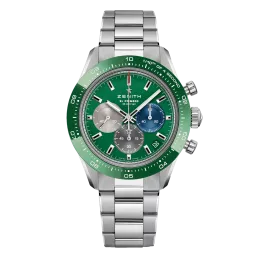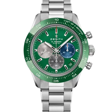 Die CHRONOMASTER Sport besitzt ein 41-mm-Stahlgehäuse mit einer grünen Keramiklünette, einem dreifarbig lackierten grünen Zifferblatt und einem Stahlarmband. Sie wird von dem automatischen Hochfrequenz-Chronographenwerk El Primero 3600 mit 1/10-Sekunden-Chronographenfunktion und einer Gangreserve von 60 Stunden angetrieben.