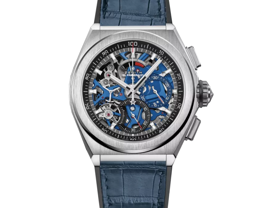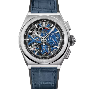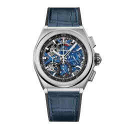 Zenith präsentiert seine geniale Inspiration beim Design technisch brillanter und optisch beeindruckender Modelle. Mit einer zusätzlich bemerkenswerten Expertise bei der makellosen Ausführung wurde diese großartige Uhr vorgestellt, die jeden Uhrenkenner mit ihrer Raffinesse, Präzision und unwiderstehlichen Erscheinung begeistern wird. Auf dem skelettierten Zifferblatt zeigen drei zentrale Zeiger die Stunden, Minuten und 1/100stel Sekunden an, begleitet von einem Hilfszifferblatt für die kleinen Sekunden auf der 9-Uhr-Position sowie auf 6 und 3 Uhr positionierte Zählerchronographen für 60-Sekunden und 30-Minuten. Gangreserveanzeige auf 12 Uhr. Die Funktionen werden von einem automatischen Uhrwerk mit 293 Bestandteilen angetrieben, das 53 Lagersteine enthält und mit einer Frequenz von 5 Hz (36.000 V/h) arbeitet. Das Gerät bietet eine Gangreserve von mindestens 50 Stunden. Der Chronograph verfügt über eine eigene Hemmung, die mit Halbschwingungen von 50 Hz (360.000 vph) arbeitet. 44 mm hat und bis zu 100 Meter wasserdicht ist. Die Uhr wird mit einem schwarzen armband mit beschichtung getragen und mit einer Faltschließe aus Titan am Handgelenk befestigt. Zenith Titanuhr, 95.9002.9004 / 78.R584