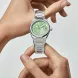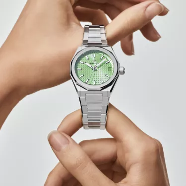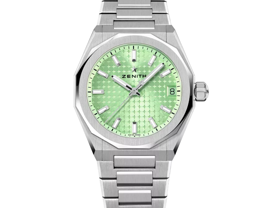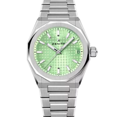 DEFY Skyline Uhr mit achteckigem 36-mm-Stahlgehäuse mit facettierter Lünette und pastellgrünem Metallic-Zifferblatt mit Sonnenschliffmuster, das den berühmten vierzackigen Stern von ZENITH neu interpretiert. Angetrieben wird sie von dem automatischen Manufakturwerk Elite 670. Auswechselbares Stahlarmband und grün gemustertes Kautschukarmband.