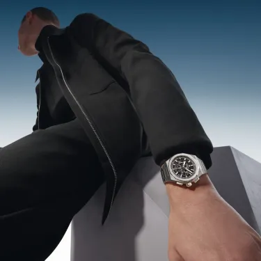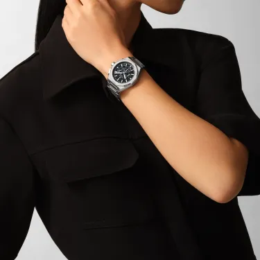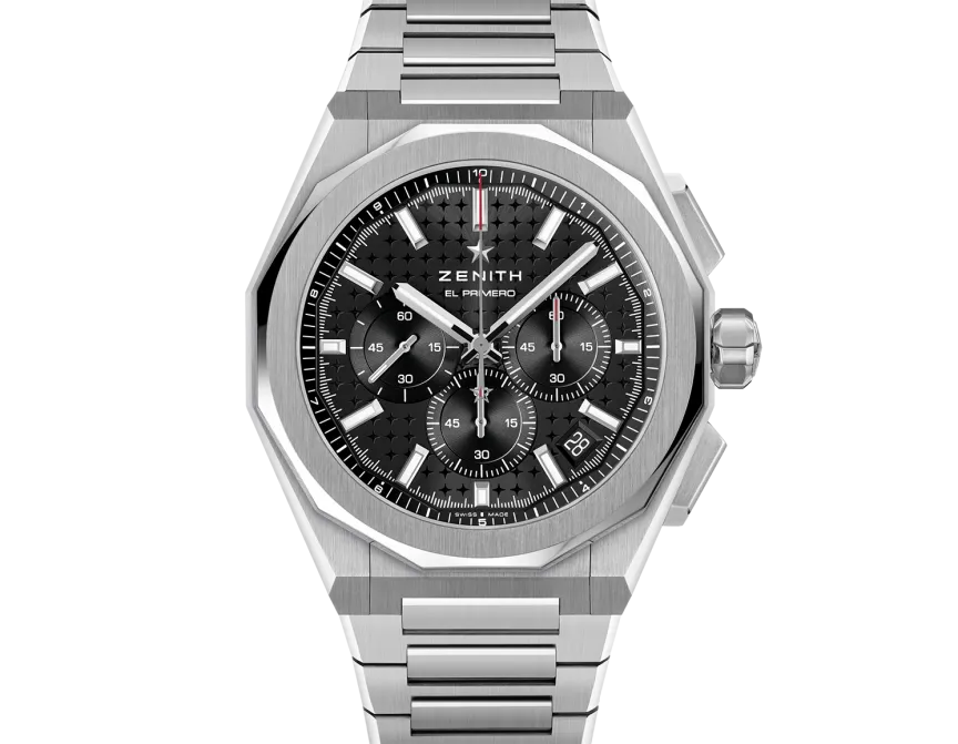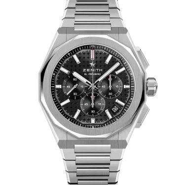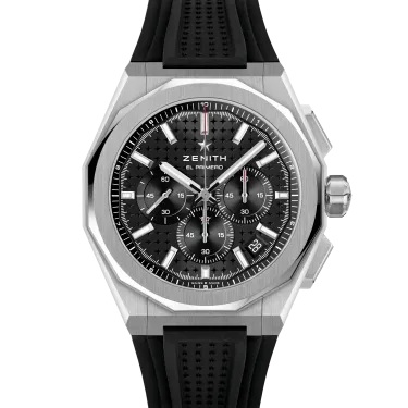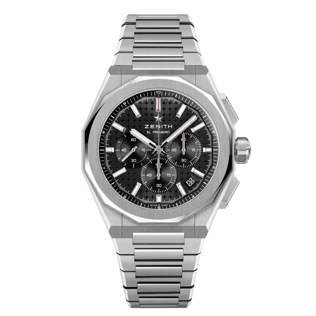 DEFY Skyline Chronograph mit achteckigem 42-mm-Stahlgehäuse, facettierter Lünette und schwarzem Zifferblatt mit Sonnenschliff, das den berühmten vierzackigen Stern von ZENITH neu interpretiert. Angetrieben von dem automatischen Hochfrequenz-Manufakturwerk El Primero 3600 mit der allerersten 1/10-Sekunden-Anzeige. Auswechselbares Stahlarmband und schwarz gemustertes Kautschukarmband.