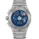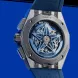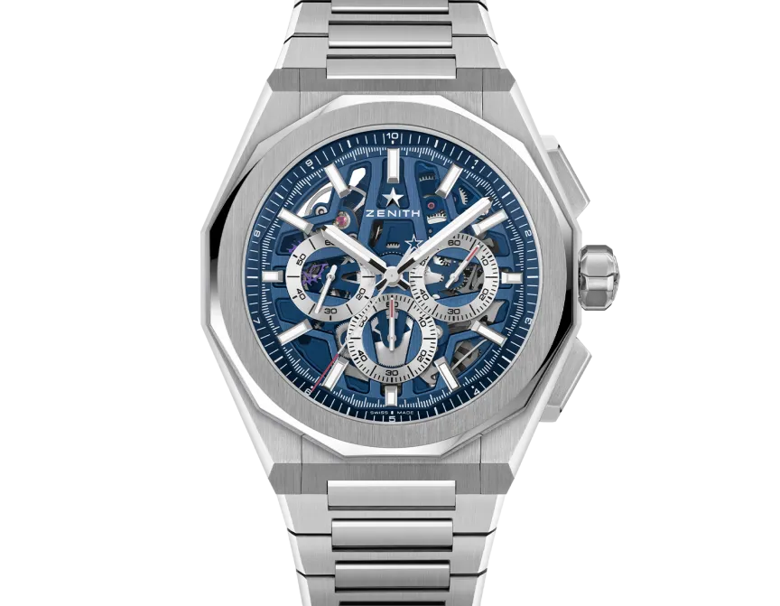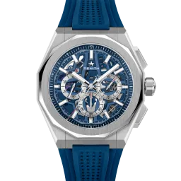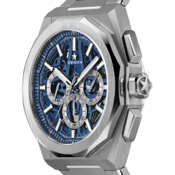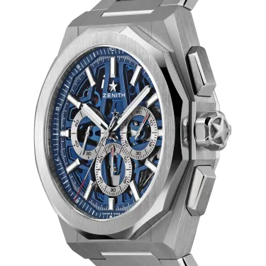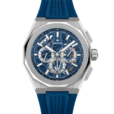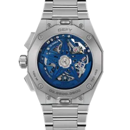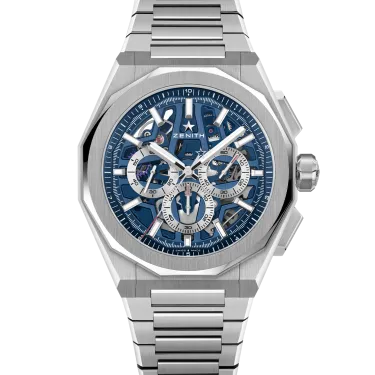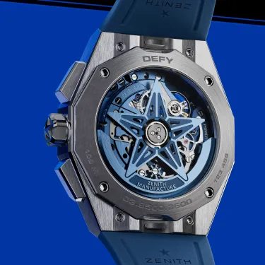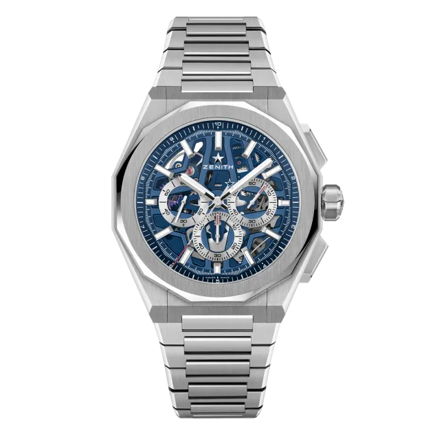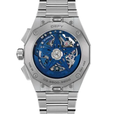 Die DEFY Skyline Chronograph Skeleton hat ein achteckiges 42-mm-Gehäuse aus Stahl mit einer facettierten Lünette, einem offenen blauen Zifferblatt und kontrastierenden silberfarbenen Zählern. Angetrieben wird sie von dem skelettierten, automatischen Hochfrequenz-Manufakturwerk El Primero 3600SK mit der allerersten 1/10-Sekunden-Anzeige.