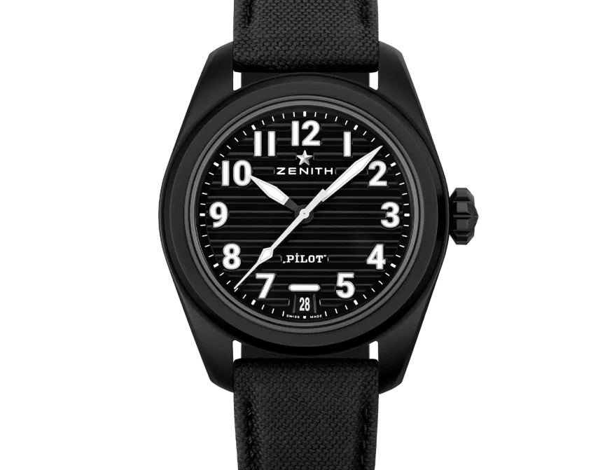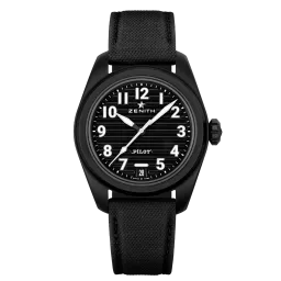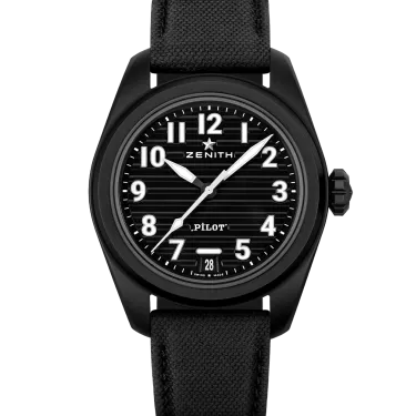 Die PILOT Automatic gehört zur neuen Generation der PILOT-Uhren von ZENITH. Sie ist in einem schwarzen 40-mm-Keramikgehäuse mit einer übergroßen Krone untergebracht und hat ein schwarzes, gewelltes Zifferblatt mit großen arabischen Leuchtziffern. Die Uhr wird mit austauschbaren Armbändern aus schwarzem oder khakifarbenem Kautschuk in Cordura-Optik geliefert. Sie wird von dem automatischen Hochfrequenz-Manufakturwerk El Primero 3620 angetrieben.