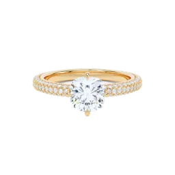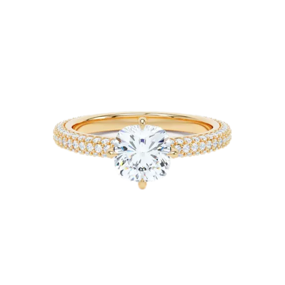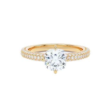 The LOEV Pavé Solitaire Ring is handcrafted with a Cushion cut diamond and set on a band of brilliant Pavé diamonds in 18kt recycled gold. The contemporary prongs hug the centre 1.5 carat Cushion which is E/F in color and of VVS2/VS1 clarity. The 3 D pavé band is set 3/4 around the band creating the perfect ring to pop the questions with. The LOEV engagement collection features lab grown diamonds grown with renewable energy.
