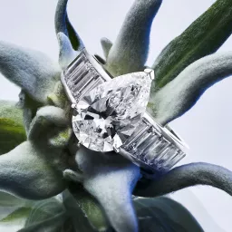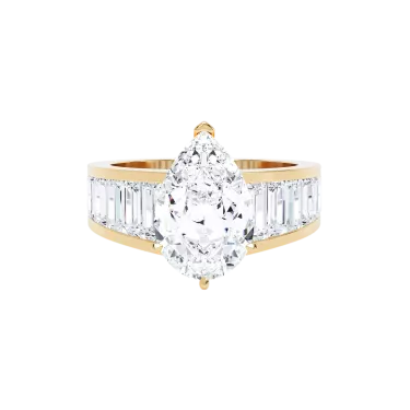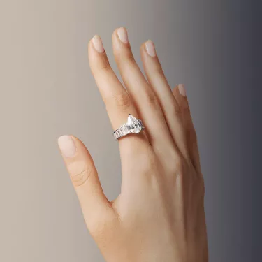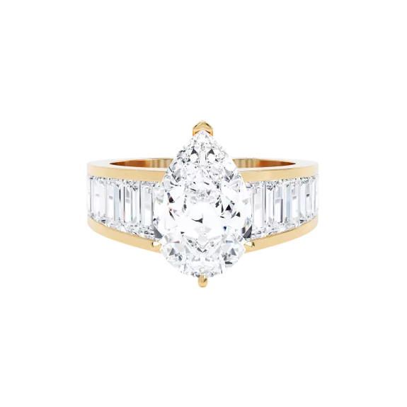 The LOEV Signature Solitaire Ring, a glamorous statement, beautifully handcrafted with a Pear cut diamond and a contrasting band of Baguette diamonds which tapers around the finger.The LOEV engagement collection features lab grown diamonds grown with renewable energy.