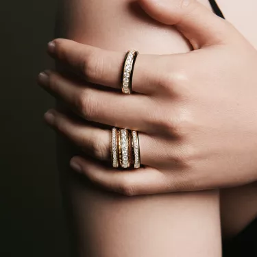 Style the black enamel Eternity ring alone or stack it with the engraved gold version. We love to see it worn on your index finger.