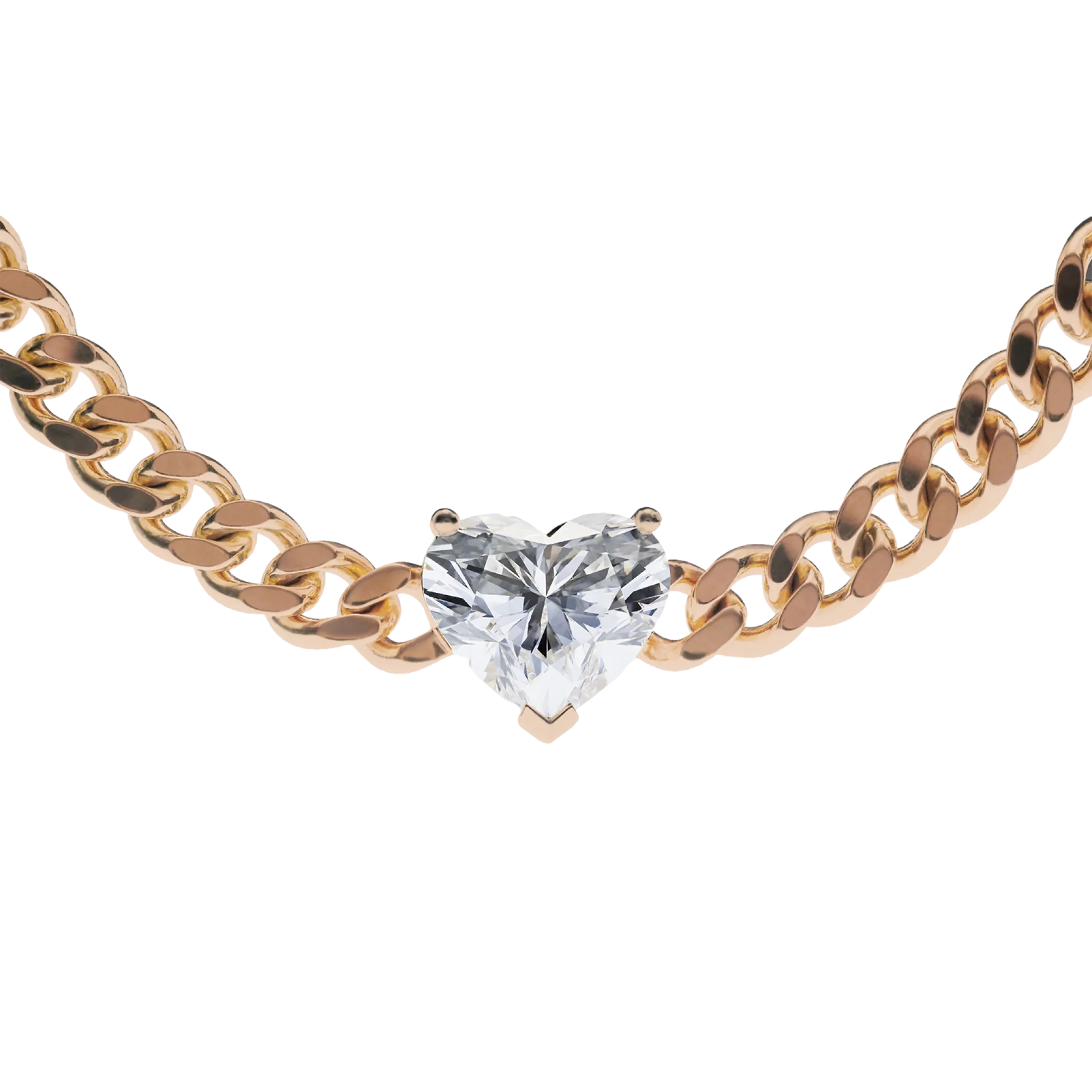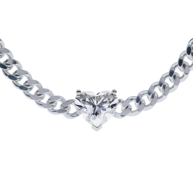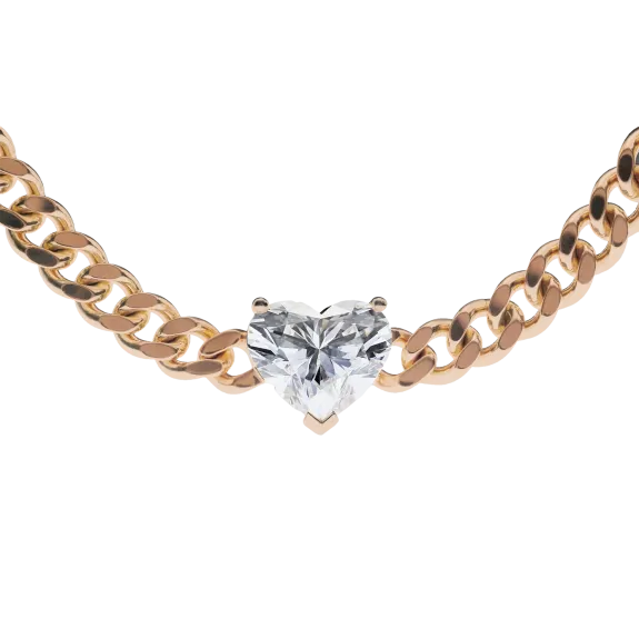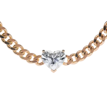 The Heart Diamond Curb Chain Necklace is a bold and beautiful statement, crafted in solid 18kt recycled gold. At its center is a dazzling 3-carat heart-cut diamond in E color and VS1 clarity, set in a timeless prong setting that lets the stone take the spotlight.