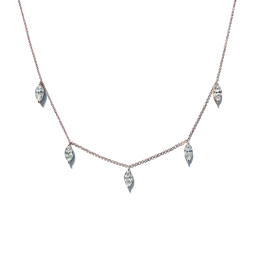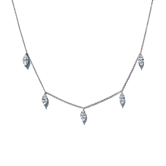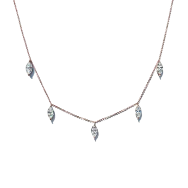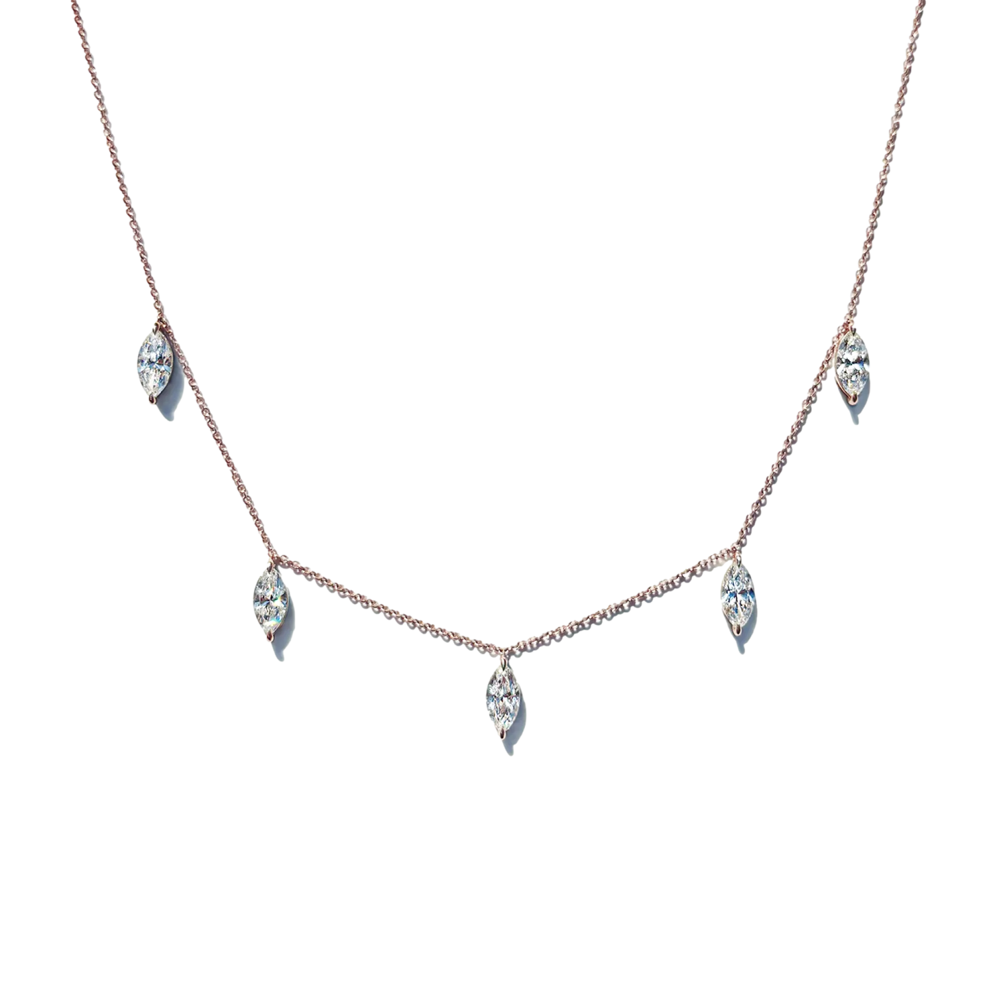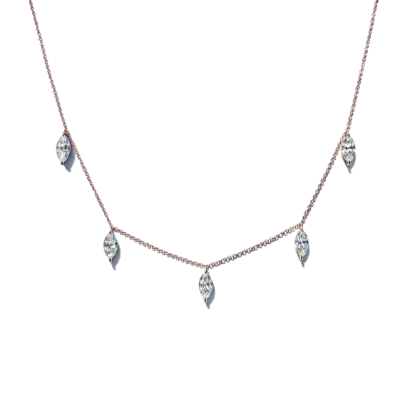 The Marquise Diamond Necklace is crafted in 14kt recycled gold and features marquise-cut lab-grown diamonds that sparkle in bright D–E color and VS1+ clarity. They flow delicately on a fine 0.9mm chain that catches the light beautifully.