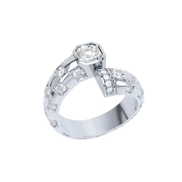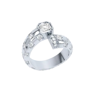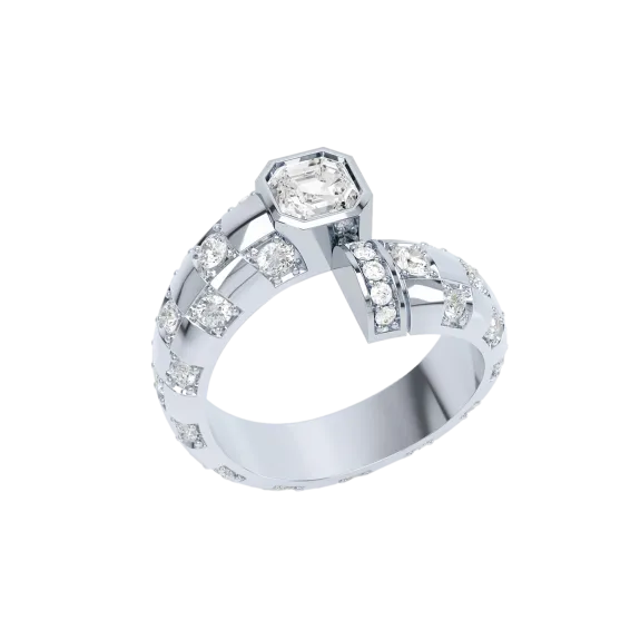 - Brilliant cut lab grown diamonds in various sizes dotted around the entire ring creating a checkerboard pattern