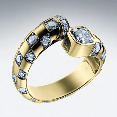 - Brilliant cut lab grown diamonds in various sizes dotted around the entire ring creating a checkerboard pattern