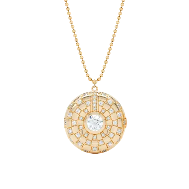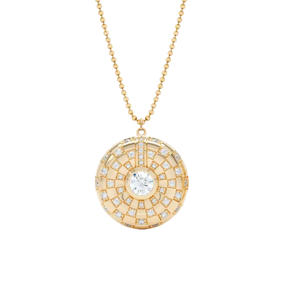 The LOEV Toi et Moi medallion features a modern checkerboard pattern created with Brilliant cut lab grown diamonds and handcrafted in 18Kt recycled gold. It comes with a 18Kt recycled gold chain.