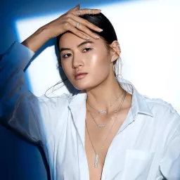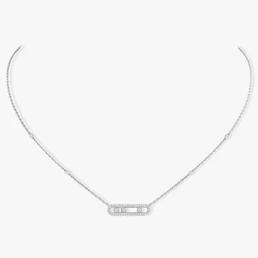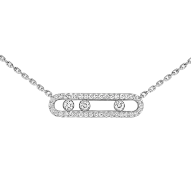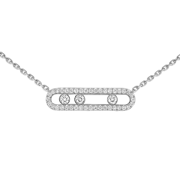 Discover the 18 carat white gold pavé diamond necklace Baby Move. This luxury necklace fully handcrafted will set down at the neckline with finesse. Any woman who seek for a trendy diamond jewel, easy to wear will love it: the three moving diamonds, symbols of the love of yesterday, today and tomorrow, shine according to one's movements. The fine setting echoes back the purity of the stones. The white gold reflects the light enhancing the purity of the diamonds. A chic detail on this white gold diamond necklace : the adorning diamonds on the chain.