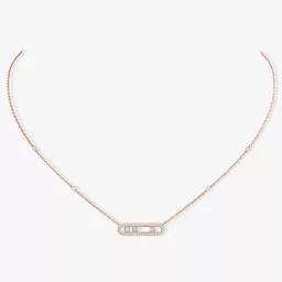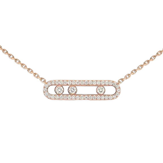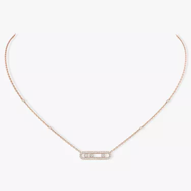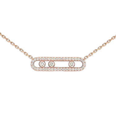 Discover this 18 carat pink gold pavé diamond necklace from the Baby Move jewelry collection. This diamond necklace for women fully handcrafted will set down at the neckline with finesse. Any woman who seek for a trendy diamond jewel, easy to wear will love this pink gold diamond necklace: the three moving diamonds, symbols of the love of yesterday, today and tomorrow, shine according to one's movements. The fine setting echoes back the purity of the stones. The shimmering pink gold, created by Messika House, is particularly soft thus the pavé necklace is a discreet luxury jewel. A chic detail: the adorning diamonds on the chain.