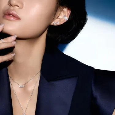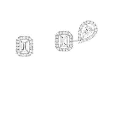 Discover online the My Twin white gold diamond earrings designed by Messika! In keeping with the trend for stackable and mismatched diamond earrings, these My Twin 1+2 18 carat white gold diamond earrings for women with a 0.10 ct pavé setting will appeal to all women, be their style bold or classic. The brilliance of white gold brings out the purity of the diamonds, accentuating their magnificent shine. On the right ear, a white diamond stud earring with a 0.10 ct emerald-cut diamond. On the left ear, a 0.10 ct emerald-cut diamond and a 0.10 ct pear-cut diamond rise up along the earlobe. On these white gold diamond earrings, the two motifs appear to be completely independent: a perfect illusion that gives the impression of two piercings and an easy-to-wear style for every occasion! Fall for this diamond jewel.