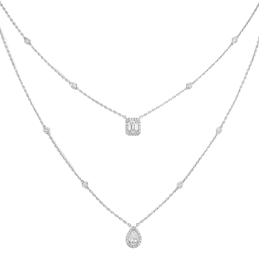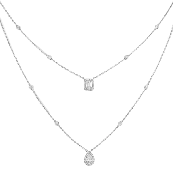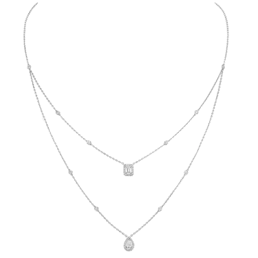 My Twin luxury Jewelry collection praises the diamond in all its shapes, cuts and specially the light effect between the pear and the emerald cuts. Valérie Messika was particularly interested in the contrast between the angular shape of the emerald cut and the rounded pear cut. This My Twin 2 rows in 18 carat white gold performs a current trend, the necklaces layering. A modern white gold diamond necklace with two chains of different length dazzling with a pear cut 0,20ct diamond and an emerald cut 0,20ct diamond on each, like solitaires. Worn with a low V neckline, an opened shirt or a turtle neck, this white gold diamond necklace nicely dresses the neck up. The luminescent white gold enlightens the diamonds purity, enhancing their beautiful radiance.