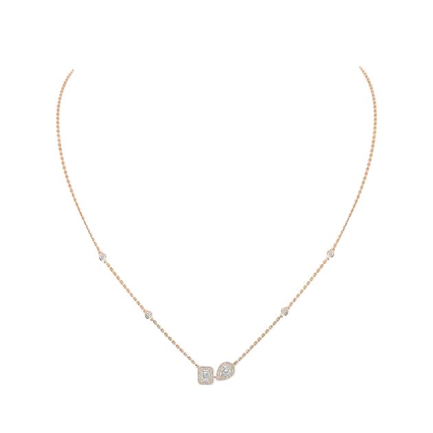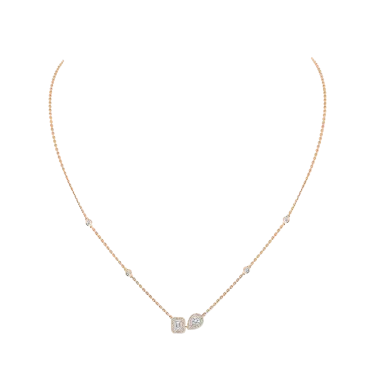 The My Twin collection marks the unexpected encounter between a sensual pear-cut diamond and an elegant emerald-cut diamond. An exceptional duo showcased in this rose gold and diamond necklace. The House's signature subtly openwork pavé setting intensifies the sparkle of the centre stones. A bold creative touch, the angle of the pear-shaped diamond adds a beautiful contemporary accent. Easy to wear, this diamond necklace will accompany you through all of life's moments, from the most intimate to the most dazzling. Dare to combine it with the Maison's other gold and diamond necklaces for a bold jewellery look.