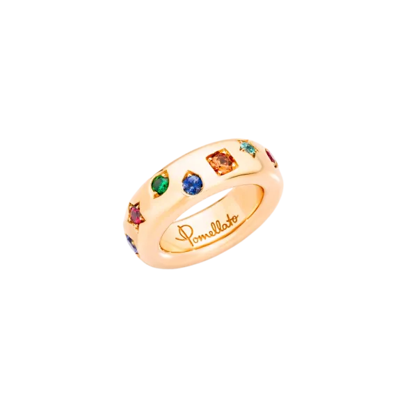 Ring in 18K rose gold with 2 treated orange sapphires (≈0.3 ct), 1 pink tourmaline (≈0.1 ct), 1 peridot (≈0.2 ct), 1 ruby (≈0.2 ct), 1 blue zircon (≈0.1 ct), 2 blue sapphires (≈0.3 ct), 1 demantoid (≈0.1 ct), 1 red spinel (≈0.1 ct), 2 tanzanites (≈0.3 ct), and 1 tsavorite (≈0.2 ct).