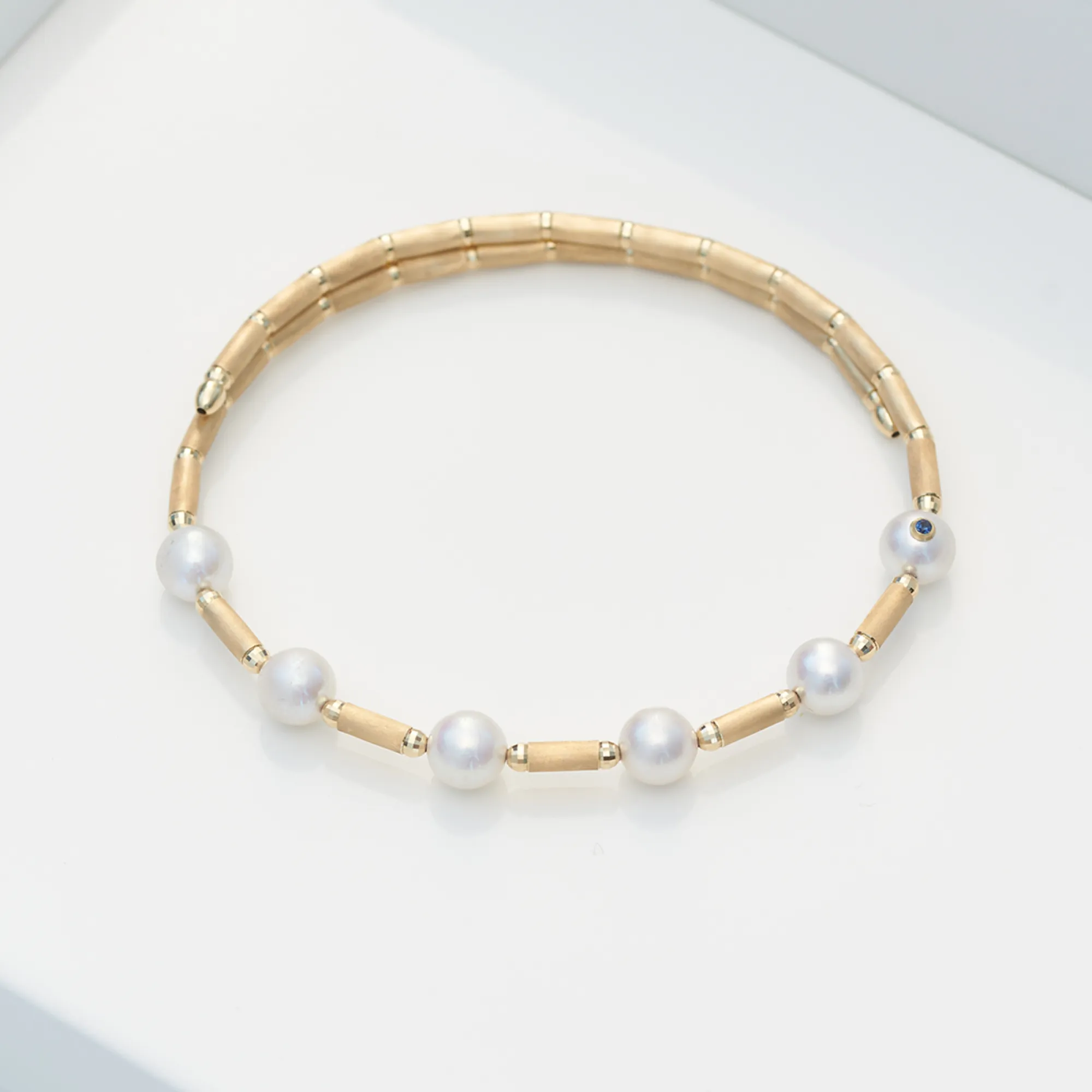 750/- yellow gold, total length 17-20cm, magnetic closure, Akoya pearls, pearl size 6-6.5mm, magnetic closure, blue sapphire.
