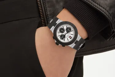 When it comes to luxury sports watches, Bvlgari is in a class of its own with this model in aluminum and black rubber. The Bvlgari Aluminium 40 was inspired by a model the brand released in 1998. It is powered by an automatic manufacture chronograph movement, and features this striking reverse “panda” dial with black counters on a light gray background.