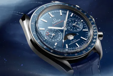 This elegant Omega Speedmaster is a great everyday watch with its sport-chic style that looks good in any situation. This model comes with three counters – one for the chronograph function at 3 o’clock (steel hand for elapsed minutes and white hand for elapsed hours), a moon phase indicator at 6 o’clock, and a date at 9 o’clock. There is also a handy tachymeter scale for measuring speed on the blue ceramic and liquid-metal bezel.