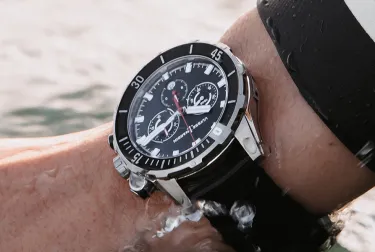 For those who like the looks and functionality of a diver’s watch but still want a chronograph, the Ulysse Nardin Diver Chronograph 44 could be the watch for you. It comes in a 44mm titanium case with a blue dial and matching blue and titanium strap. And with 300 meters of water resistance, this automatic watch is ready for any adventure.