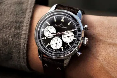 features what the watch experts call a “panda” dial. This combination of white subdials against a black background was popular in the 1960s and 70s and has seen a revival in recent years. This watch’s vintage vibe is enhanced with a brown Norlando leather strap with the brand’s characteristic stitches that resemble mountains. The timepiece is powered by the brand’s automatic caliber that can be admired through a sapphire crystal caseback.