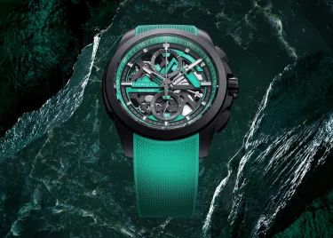 The turquoise of crystalline waters infuses the NORQAIN Wild One Skeleton with an eternal summer spirit. Every detail seems to breathe freshness and lightness, like a plunge into an alpine lake on an August day. The 39 mm NORQAIN Wild One Skeleton stands out with its black NORTEQ® case accented by turquoise touches. The automatic NN08S caliber animates the skeleton dial, revealing its inner mechanics. Water-resistant to 200 meters and weighing just 64 grams, this watch embodies the spirit of exploration.