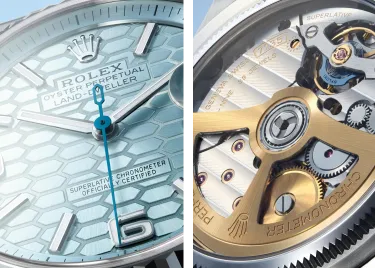 Its 40 mm Oystersteel case, inspired by the angular lines of the 1970s Oysterquartz models, pairs harmoniously with an integrated Flat Jubilee bracelet, creating a fluid, contemporary silhouette. The glacier-blue dial, adorned with a femtosecond laser-engraved honeycomb pattern, reflects light with icy intensity, while applied Arabic numerals at 6 and 9 o’clock evoke the Explorer. Water-resistant to 100 meters, the Land-Dweller combines robustness and elegance, embodying Rolex’s spirit of innovation and exploration.